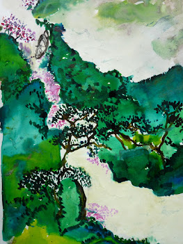 Un été après, en 2012, sans doute encouragée par toutes mes expériences récentes, je faisais des petits tableaux, dix exactement, pour mon récit issu de la terrible fin de vie de ma mère, " Le dément voyage" auto édité en 2012.